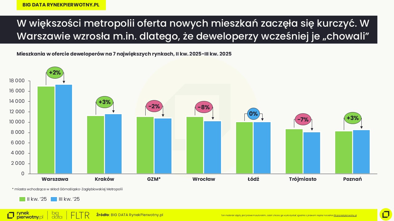Zdaniem ekspertów portalu RynekPierwotny.pl, za niepokojący z punktu widzenia potencjalnych nabywców nowych mieszkań należy uznać spadek ich podaży. W siedmiu metropoliach deweloperzy wprowadzili do sprzedaży w trzecim kwartale łącznie ok. 10,1 tys. mieszkań, czyli aż o 26% mniej niż w drugim kwartale.